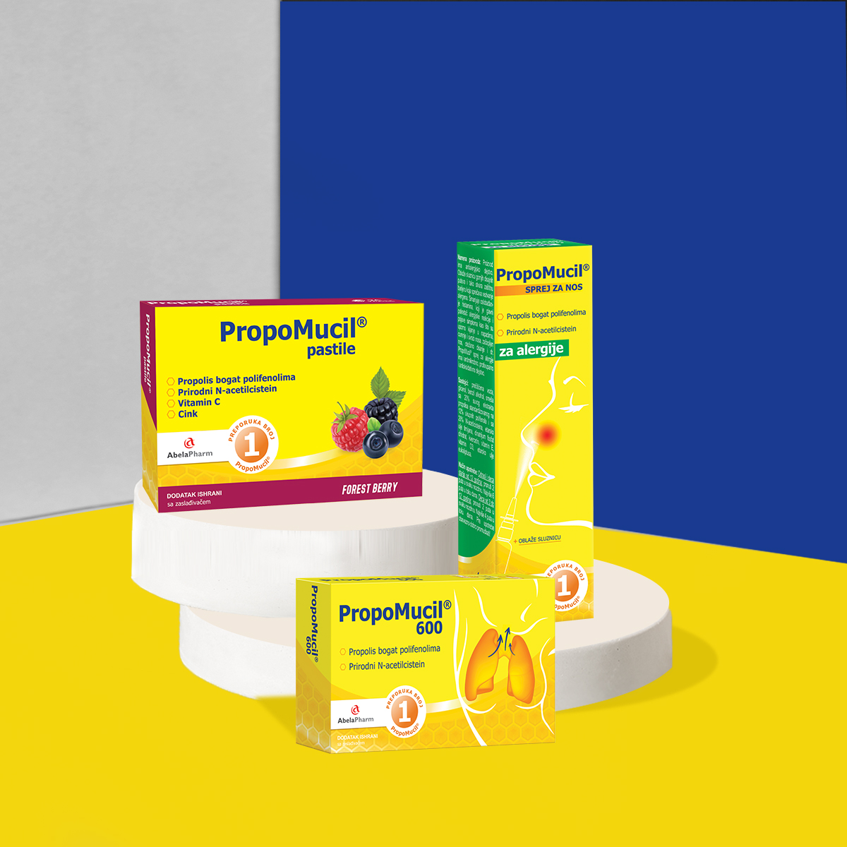 Sastav paketa: Propomucil® sprej za alergije, Propomucil® pastile sa ukusom šumskog voća i Propomucil® kesice.